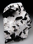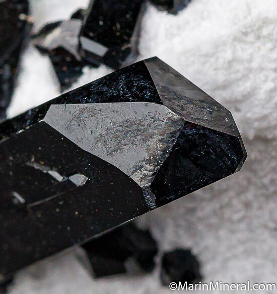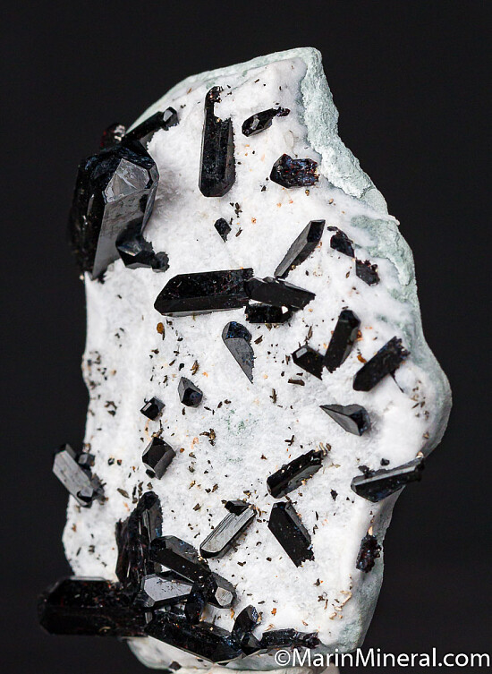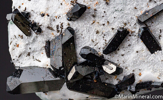 Thick, lustrous black Neptunite crystals on a flat matrix of Natrolite over schist. This is an old Steve Perry specimen that I purchased from Steve about 20 years ago and have kept in my collection ever since. All the crystals are terminated and undamaged, the main crystal is 2.5cm long. There are small brown Joaquinite crystals on the Natrolite.