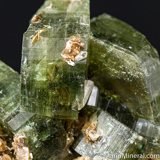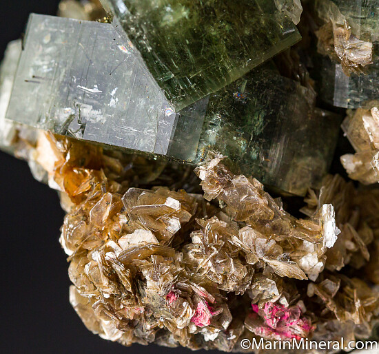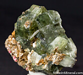 Colorful specimen of large green Apatite crystals, Muscovite, and acicular needles of Tourmaline. Largest Apatite is 2.7cm. Some chipping present. Old piece from the Chuck Trantham collection. Comes with a Lidstrom's label showing a price of $30 from 1973.