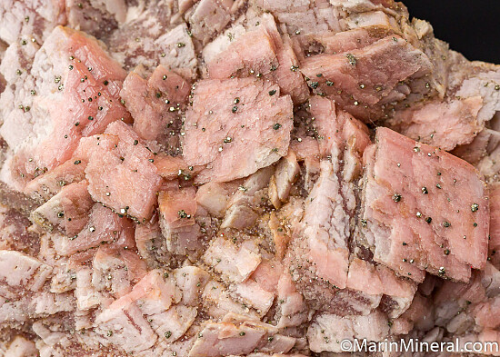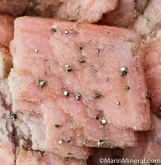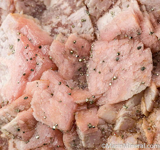 Historic Rhodo specimen from the Emma Mine with a mixture of both light and medium pink colored crystals. Crystals reach 2.5cm in size and are undamaged. No matrix, specimen is solid Rhodochrosite with tiny pyrite crystals on the surface. Old material from the Chuck Trantham collection purchased by Chuck at the 1995 Tucson show.
