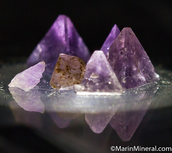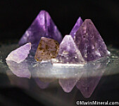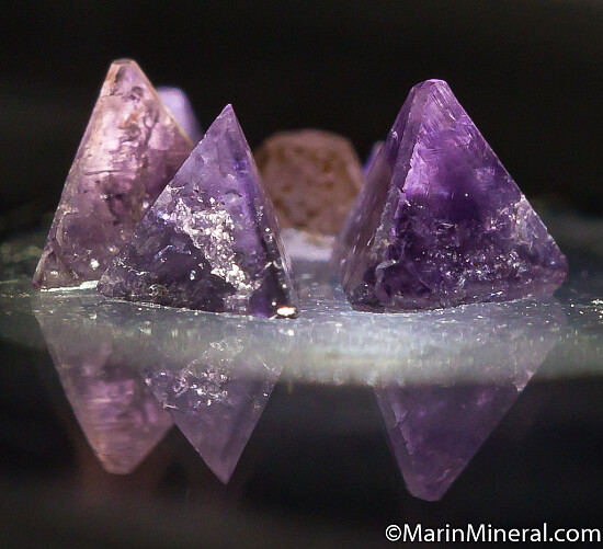 Six crystals of Chambersite. Five are complete tetrahedrons, some with modified terminations. Largest is 3mm on edge. The crystals are translucent light to dark purple in color. A rarity that are also quite beautiful with an amethyst-like color. Collected by Fred Pough in 1970. Ex. Chuck Trantham collection.