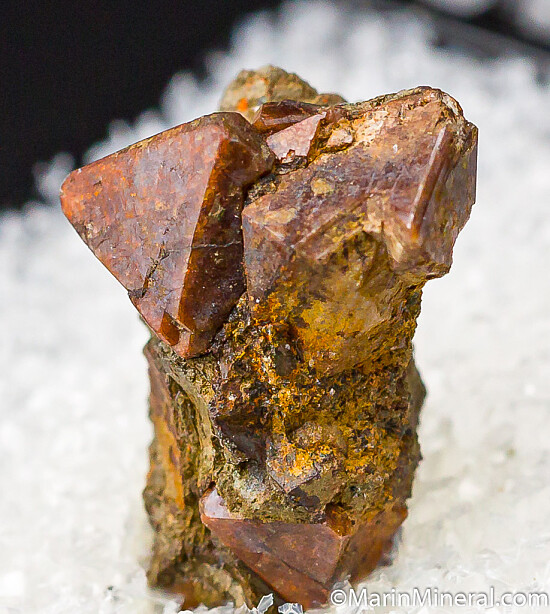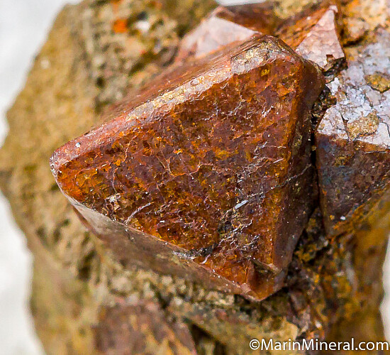 Sharp reddish brown Zircon crystals in matrix from a classic and seldom seen Colorado locality. The main crystal is 6mm on edge and pristine. Ex. Chuck Trantham collection.