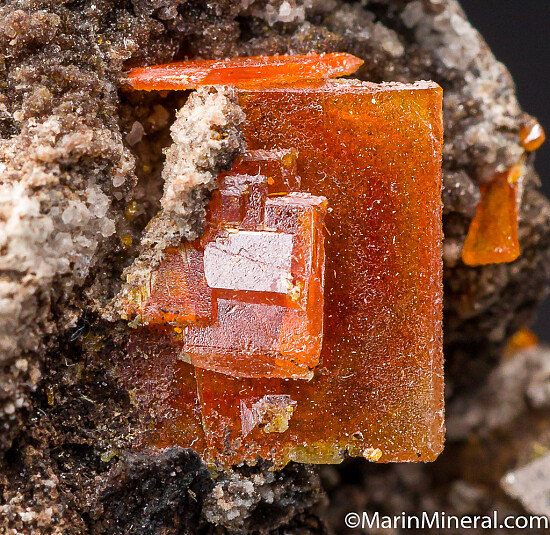 Dark matrix with attached orange Wulfenite crystals to 9mm. Ex. Chuck Trantham collection.