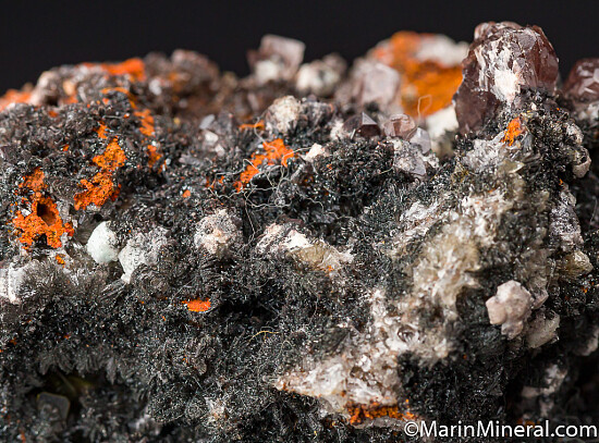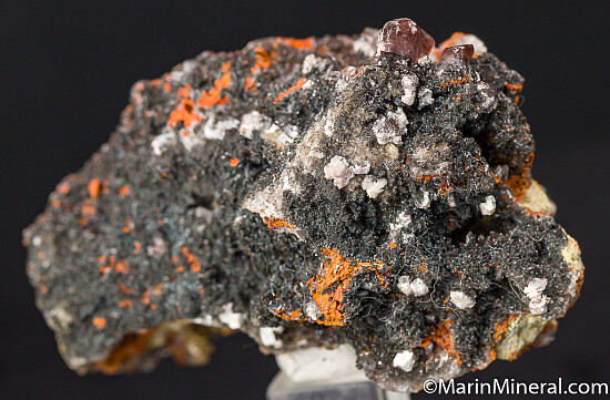 Neat old combination specimen from this prolific mine. Black Plattnerite desnly covers one side, associated with two different style of Calcite, thin tabular wulfenite crystals, a drusy areas of Hemimorphite crystals. Ex. Chuck Trantham collection.