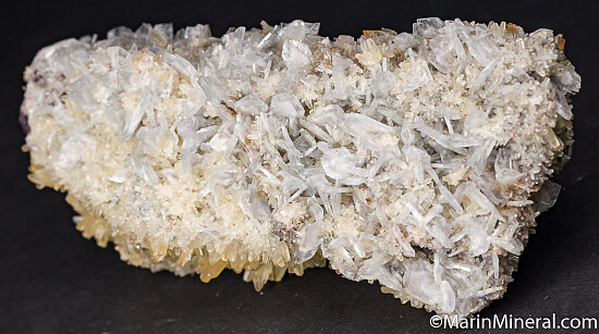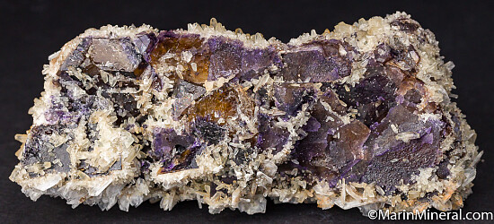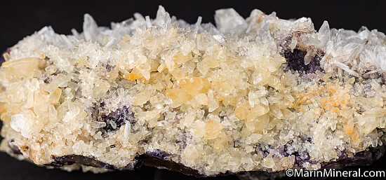 Large specimen of purple and yellow Fluorite crystals that are covered on top and sides by white bladed Barite crystals and yellow scalenohedral Calcite crystals. In good condition, nothing but crystals everywhere.