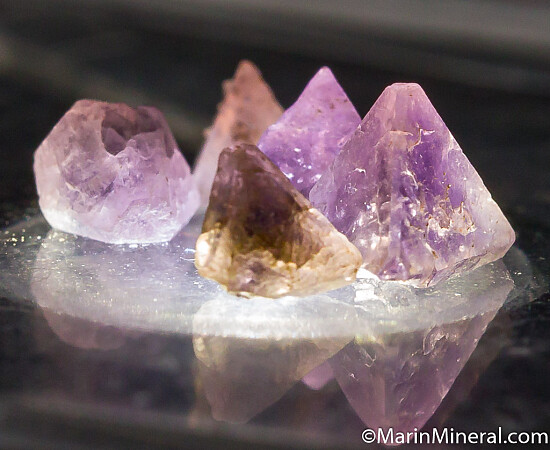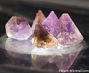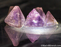Five crystals of Chambersite. Four of the five are complete tetrahedrons, some with modified terminations. Largest is 4mm on edge. The crystals are translucent light to dark purple in color. A rarity that are also quite beautiful with an amethyst-like color. Collected by Fred Pough in 1970. Ex. Chuck Trantham collection.