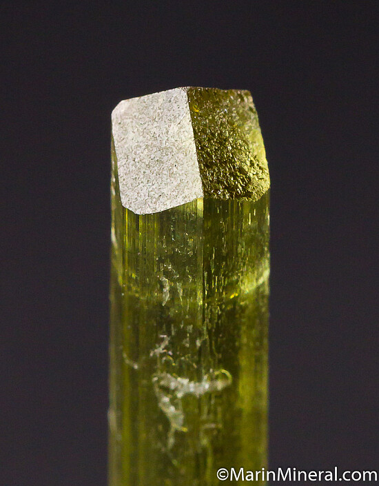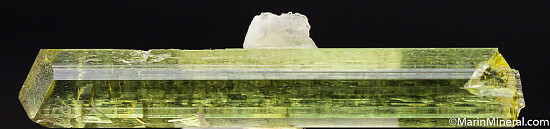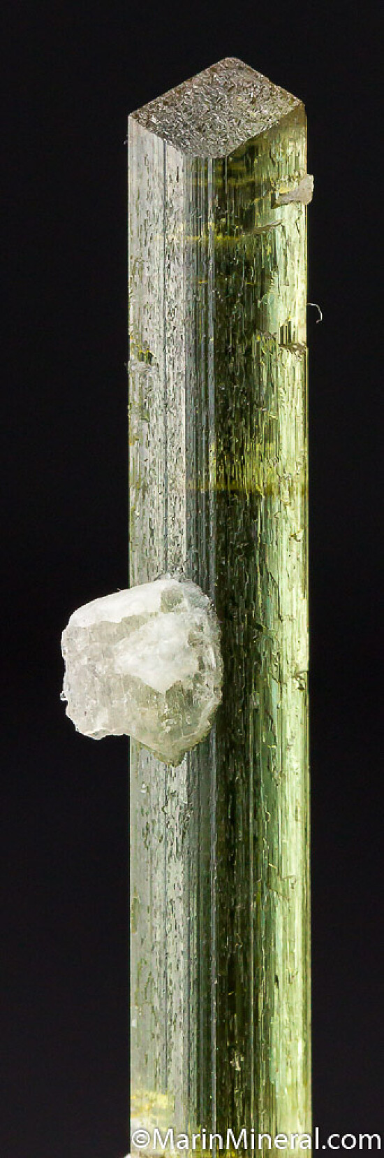 Gem quality single green Tourmaline crystal with an attached crystal of Albite. Perfectly terminated on one end and partailly recrystallized on the other end. There are a few shallow indentations from other now gone Albite crystals. Clean, transparent, and undamaged. Weighs 2.04 grams.