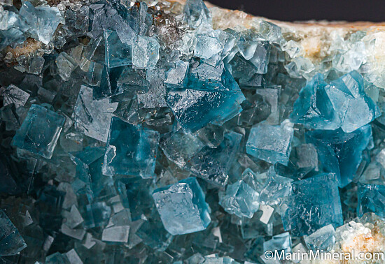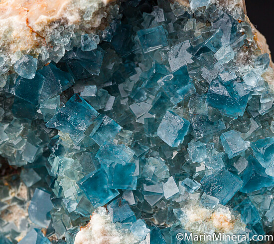 Blue cubes of Fluorite to 9mm covering the front of specimen. Translucent to transparent with the great blue color that the Blanchard Mine is known for. Ex. Chuck Trantham collection.