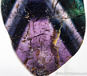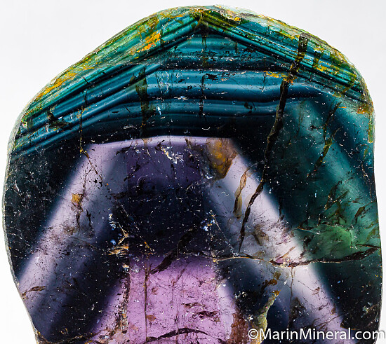 Cut and polished slice of Liddicoatite (a species of Tourmaline) from old finds in Madagascar. Cut parallel to the C-axis, the slice reveals the colorful interior of what would have appeared to otherwise be a dark crystal. Triangular color zoning of greens, blues, and purple. Well polished on both sides, weighs 87.09 grams.