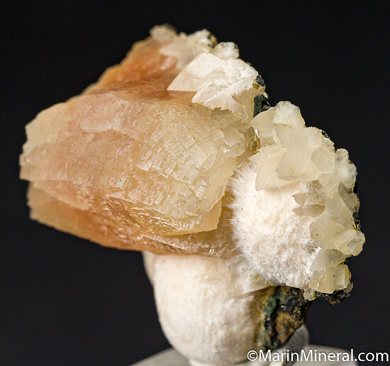 Bi-colored Heulandite crystal with Mordenite and Calcite crystals. A fine quality double-terminated Heulandite 2.2cm wide. Hard to find old specimen from Chuck Trantham personal collection.