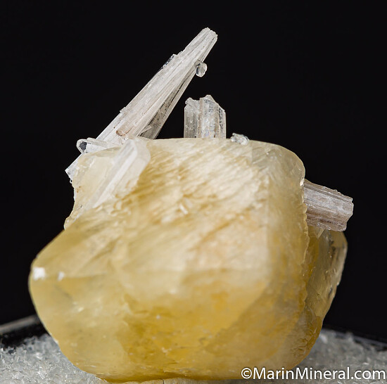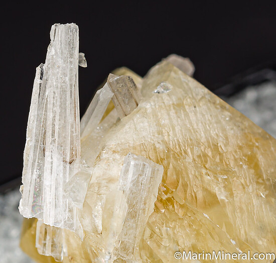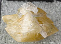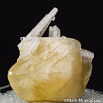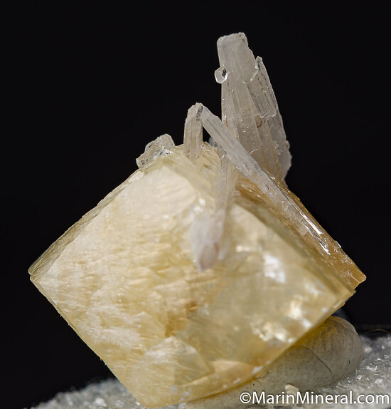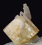 Double-terminated yellow Calcite crystal with attached Celestite crystals. The Calcite is a fine quality, complete and undamaged crystal all around. It's photographed upside down really, as it it grew on the tips of the Celestite. Ex. Chuck Trantham collection.
