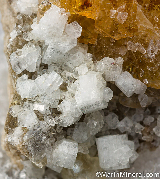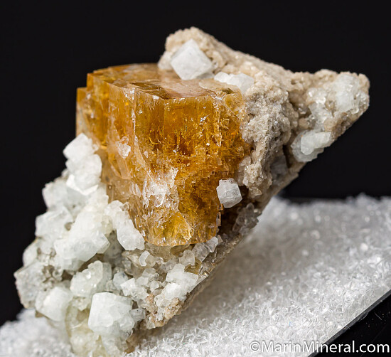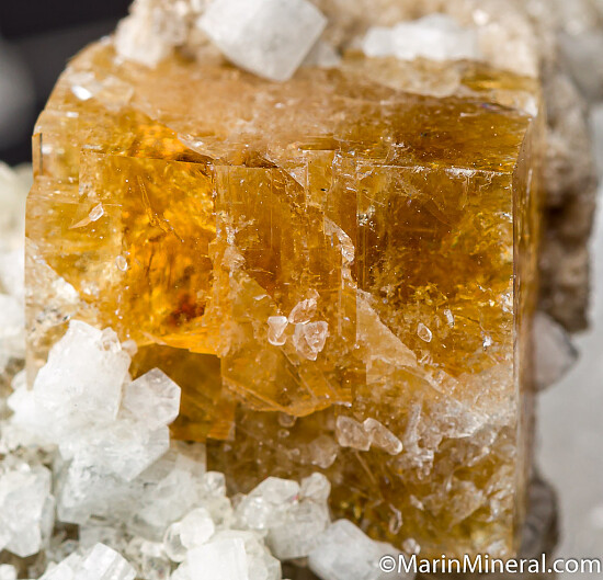 Golden Fluorite cube with associated Calcite crystals. The Flourite is 1.7cm on the diagonal. Ex. Jay Medici, Chuck Trantham collection.