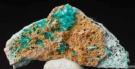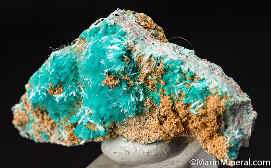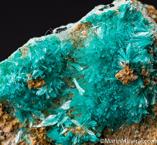 Needles of greenish blue Aurichalcite on both sides of matrix. Ex. Chuck Trantham collection.