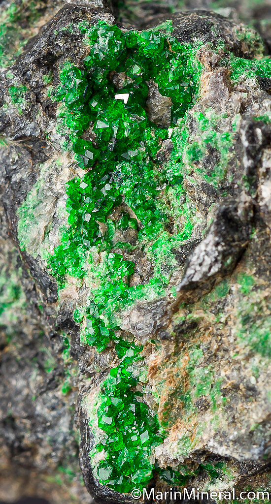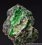 Vidid green sparkling Uvarovite crystals on Chromite matrix. Uncommon california specimenEx. Chuck Trantham collection. Collected by Chuck in 1982.