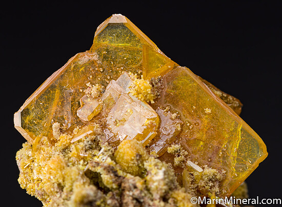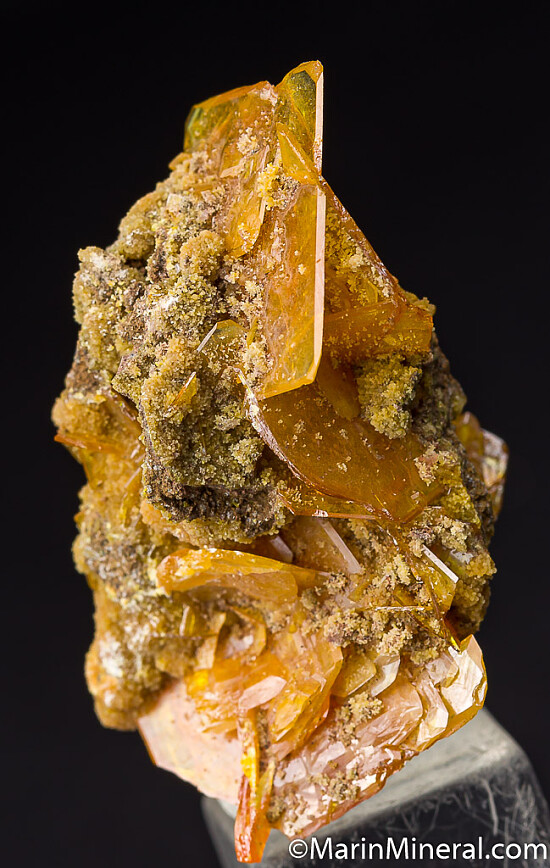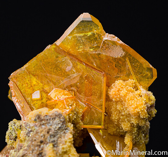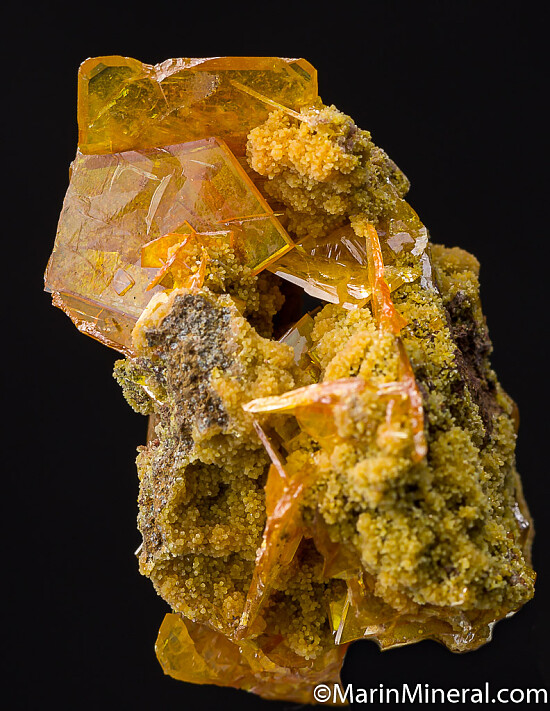 Orange/yellow Wulfenite crystals to 2cm with associated Mimetite. Classic San Francisco Mine specimen. Ex. Chuck Trantham collection.