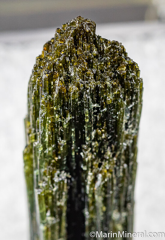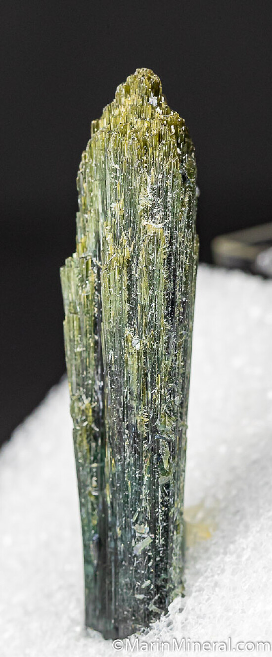 Long, feathery green Tourmaline crystal. Complete and undamaged crystal from old Brazilian production. Translucent blue/green at the base grading up to a more olive green at the termination. Ex. Chuck Trantham collection.