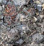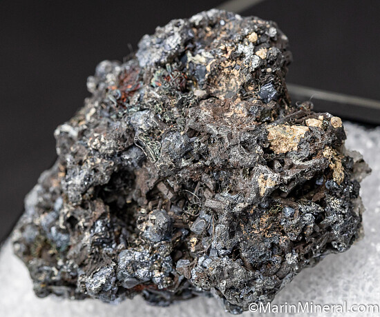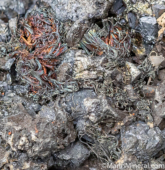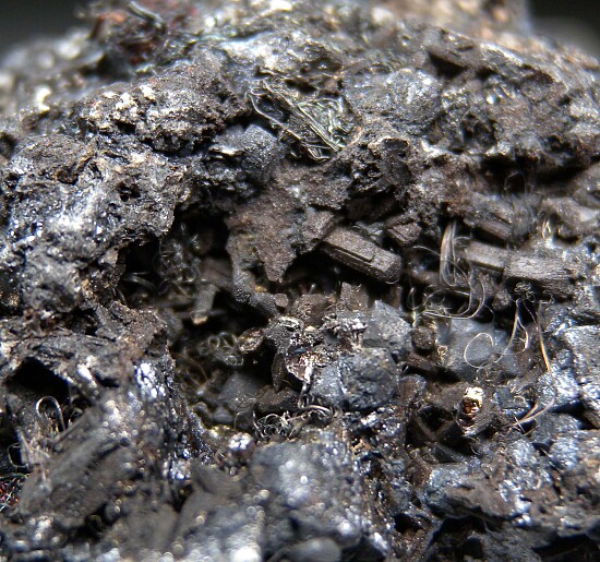 Silver wires in vugs all over specimen. There are also some unidentified elongated crystals in the vugs. Ex. Chuck Trantham collection.
