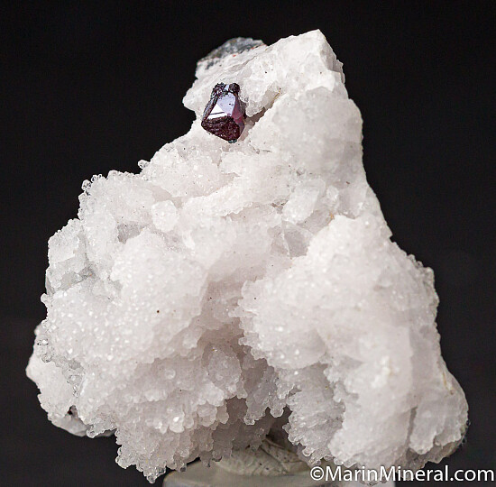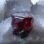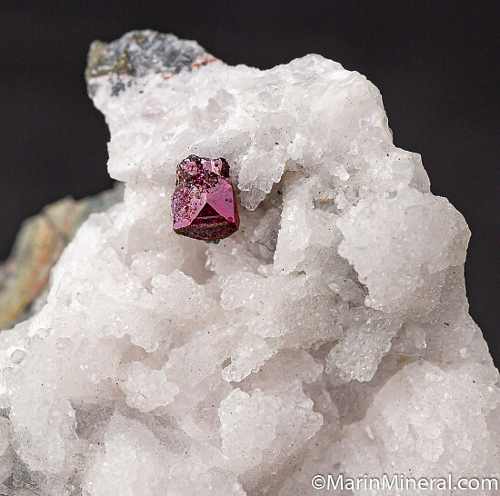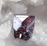 Well formed single Proustite crystal that contrasts well against white Calcite. The Proustite is 5mm and shows excellent deep blood red color. Ex. Chuck Trantham collection, comes with an old Trinity Mineral Co. label.