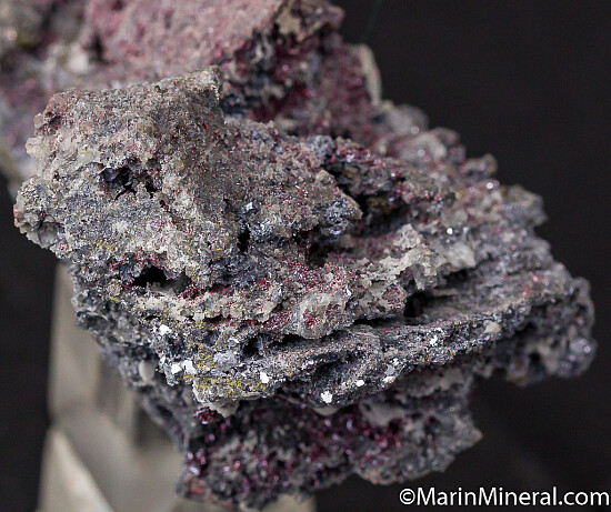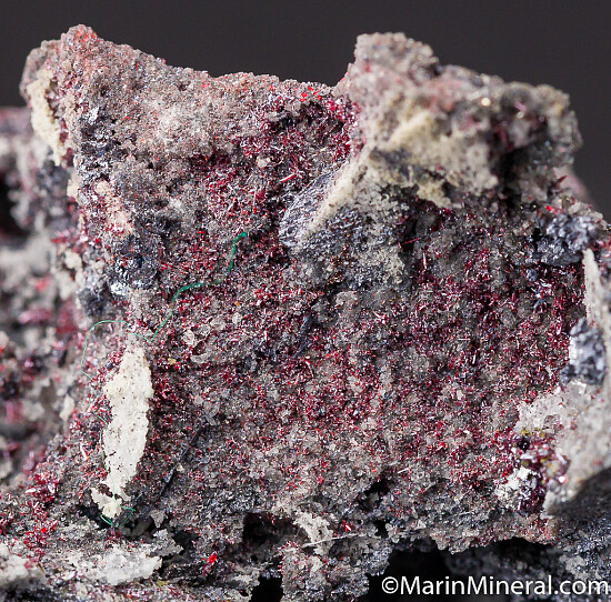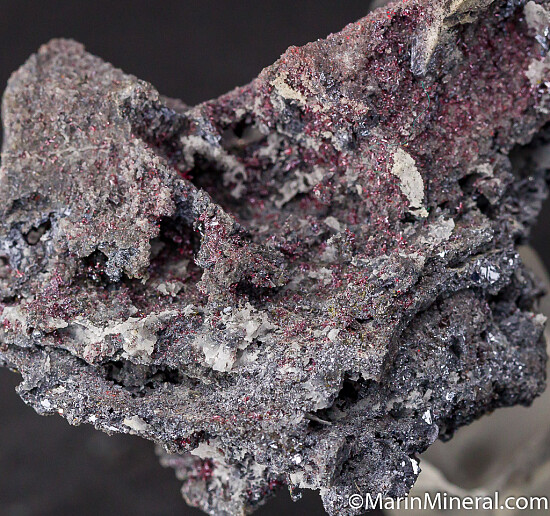 Abundant crystals of cherry-red Proustite lining multiple vugs in matrix. Good crystals of Proustite are all over the specimen. Ex. Chuck Trantham collection.