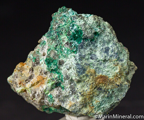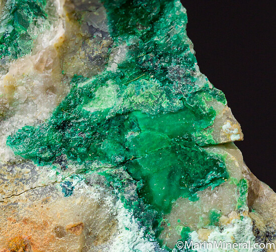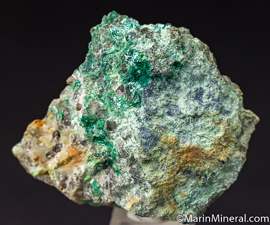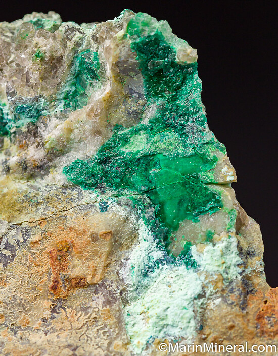 Areas of deep green Cornubite in matrix. Cornubite is a rare secondary copper arsenate mineral. Uncommon specimen from the Chuck Trantham collection.