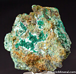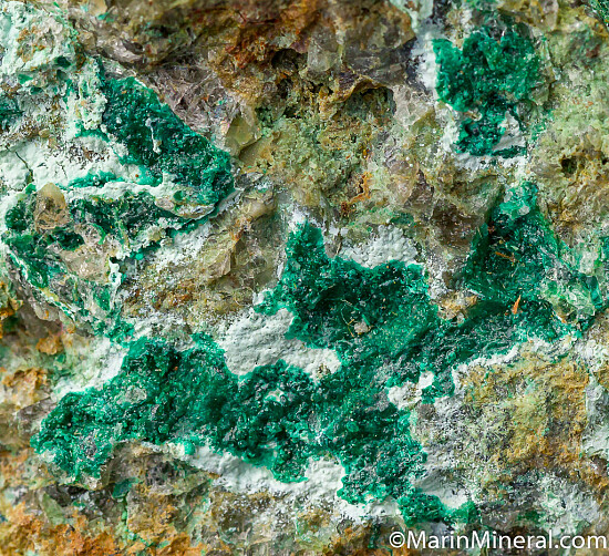 Areas of deep green Cornubite in matrix. Cornubite is a rare secondary copper arsenate mineral. Uncommon specimen from the Chuck Trantham collection.