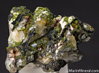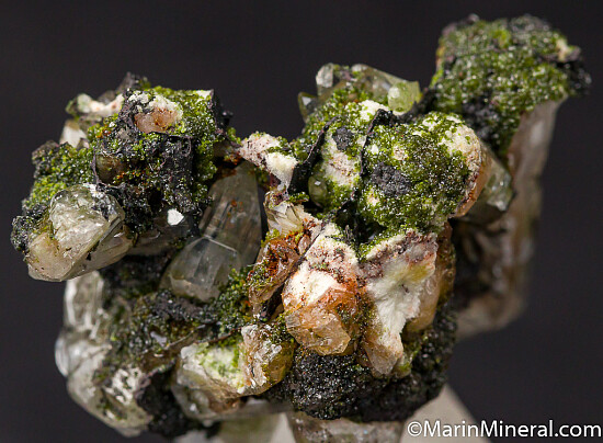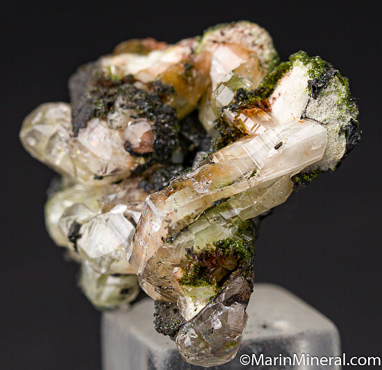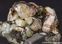 Cluster of glassy Cerussite crystals with attached green Mottramite. Good crystals all around. Ex. Chuck Trantham collection.