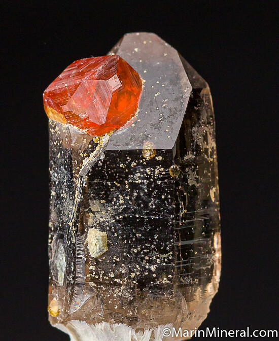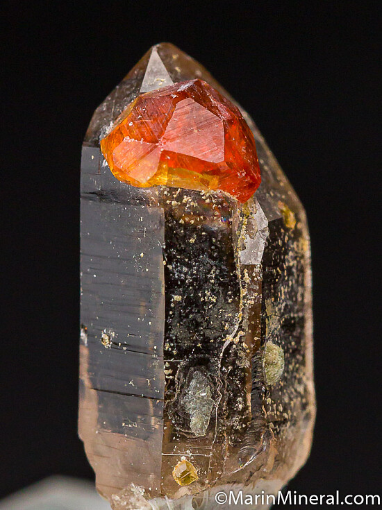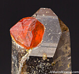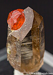 A 5mm orange Spessartine crystal attached to a terminated, transparent smokey Quartz crystal. Undamaged. Ex. Chuck Trantham collection.