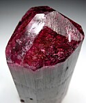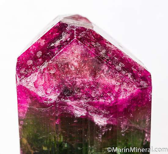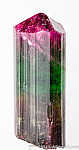 Large, thick single Tourmaline crystal from the Terra Corrida claim in Brazil. A tri-colored crystal with an orange/red base, a more transparent bright green center, and vivid pink/red termination. The termination is pyramidal with six faces. This is a big crystal weighing approximately 170 grams (my gram scale only goes to 100 grams so I had to weigh it on my postal scale). Complete all around and undamaged though there is a relatively flat contact or shallow etching on one of bevelled termination faces.