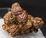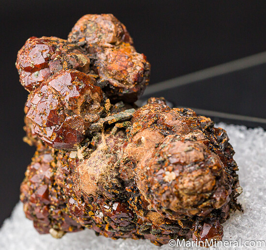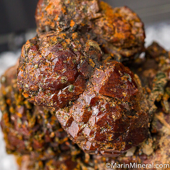 Clusters of red/orange Andradite crystals with small crystals of attached Scheelite and Epidote. Ex. Chuck Trantham collection.