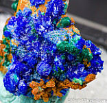 Crystals of deep blue Linarite and green Brochantite. The Linarite formed spherical masses of bladed crystals. Ex. Chuck Trantham collection.