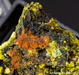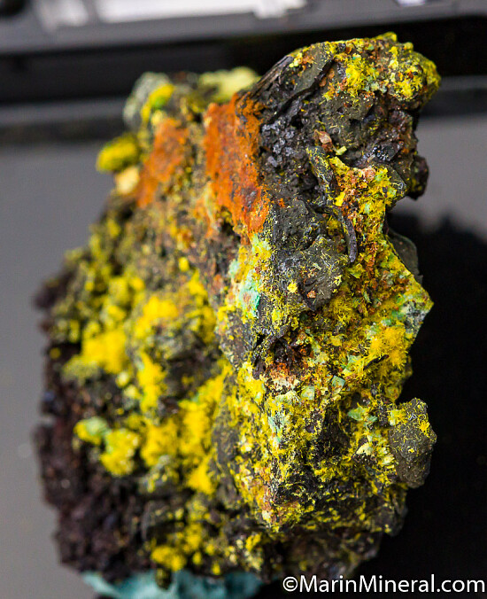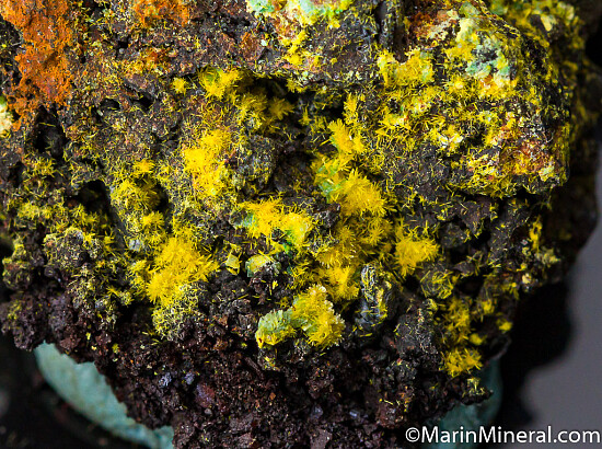 Areas of yellow Phurcalite, a uranium phosphate mineral, on matrix. Good needle-like crystals. Uncommon specimen from the Chuck Trantham collection.
