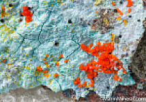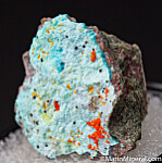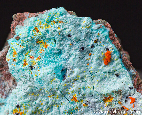 Orange Mimetite on Chrysocolla from an old mine that closed in 1930. Uncommon and colorful specimen. Ex. Chuck Trantham collection.