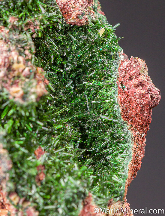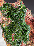Good, lustrous needle-like crystals of olive green Libethenite lining a vug. Ex. Chuck Trantham collection.