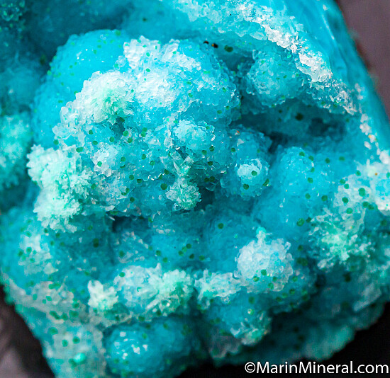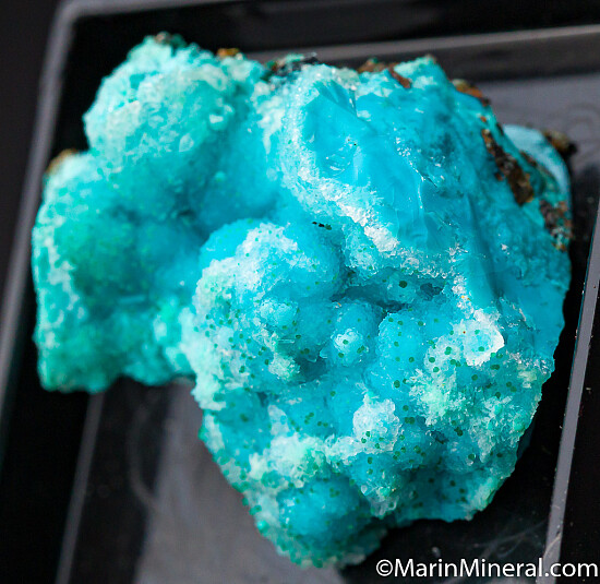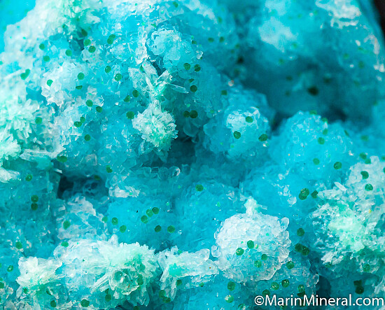 Green Pseudomalachite spheres atop deep blue Chrysocolla. Really nice under a loupe. Ex. Chuck Trantham collection.