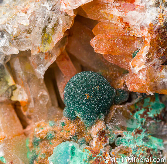 A perfect 5mm sphere of satiny Malachite crystal in a Quartz crystal lined vug. Ex. Chuck Trantham collection.