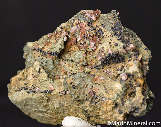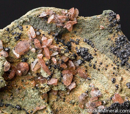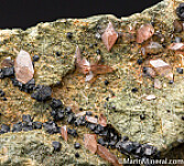 Pink Titanite (Sphene) crystals associated with black Andradite var. Melanite. This is one of only a handful of specimens found decades ago and a true rarity for a California or San Benito Co. collector. Ex. Chuck Trantham collection, collected by Chuck and Al McGuinness in 1984. This was the second best pink Titanite I saw in the collection, and Chuck had it priced at $200.