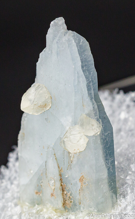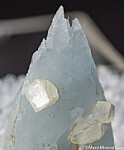 Well terminated single Celstite crystal. Light blue with tapering form and attached Calcite ccrystals. Complete all around and undamaged. An excellent Michigan Celestite in the thumbnail size. Ex. Chuck Trantham, Jay Medici.