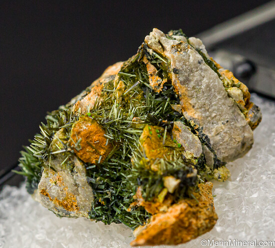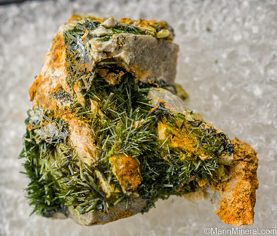 Needle-like crystals of green Olivenite on matrix from the Majuba Hill Mine, likely from the Copper stope. Ex. Chuck Trantham collection.
