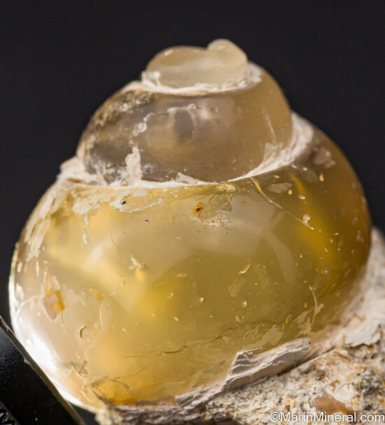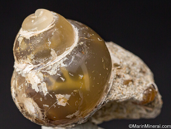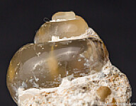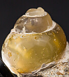 Fossil freshwater snail (species Campeloma) that has been partially replaces by translucent Chalcedony. Ex. Chuck Trantham collection.