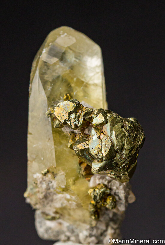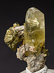 Superb Single Calcite crystal with attached Chalcopyrite. This is not your typical translucent, drab 'Post-it note' yellow Calcite from the Sweetwater - it's transparent with a bright golden yellow color. Complete all around, fine thumbnail. Ex. Chuck Trantham collection.
