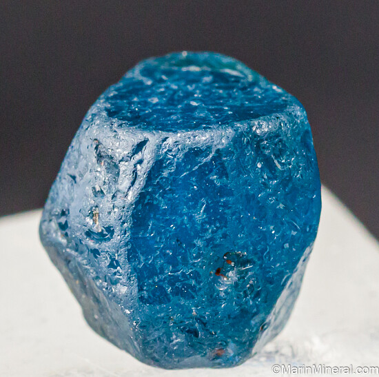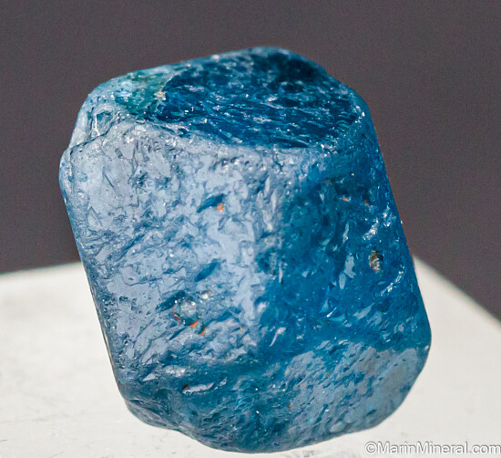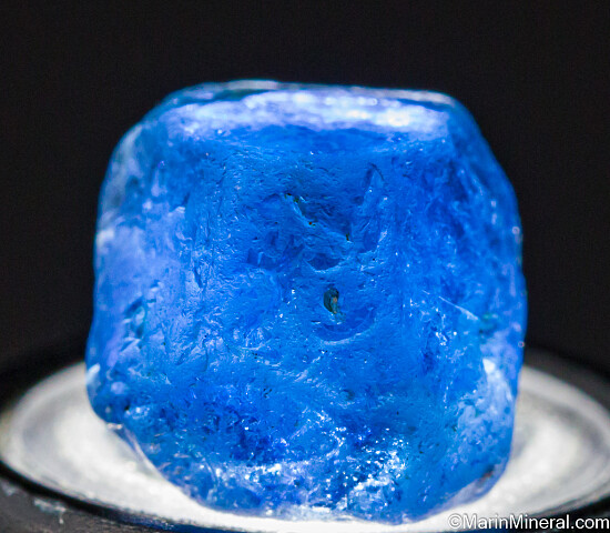 Transparent blue Gahnite crystal, the zinc rich end member and one of the rarer species in the Spinel group of minerals. It's an octahedron with some damage, but good sized and the color is superb. Translucent to transparent. These were first discovered in 2001 and are found mostly of industrial quality. Though they don't get very large, the color is spectacular. The GIA has written a nice article about these crystals published in Gems & Gemology, Fall 2019, Vol. 55, No. 3.