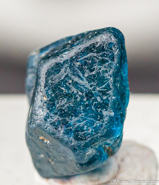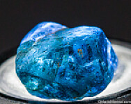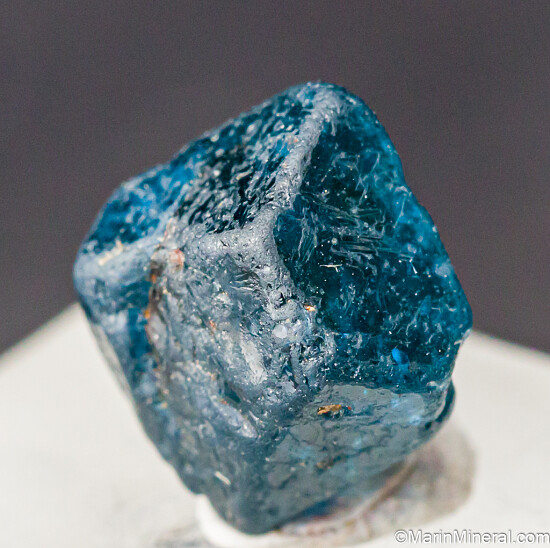 Transparent blue Gahnite crystal, the zinc rich end member and one of the rarer species in the Spinel group of minerals. It's an octahedron with some damage, but good sized and the color is superb. Translucent to transparent crystal. These were first discovered in 2001 and are found mostly of industrial quality. Though they don't get very large, the color is spectacular. The GIA has written a nice article about these crystals published in Gems & Gemology, Fall 2019, Vol. 55, No. 3.