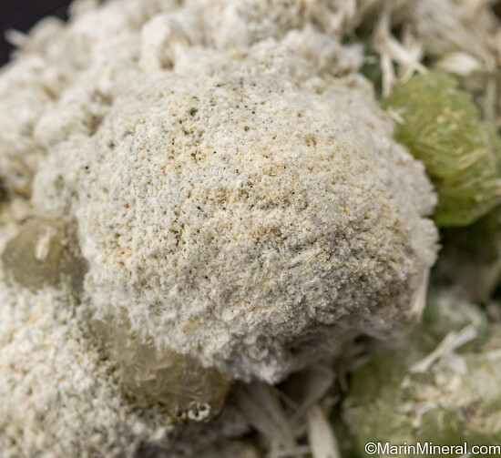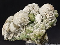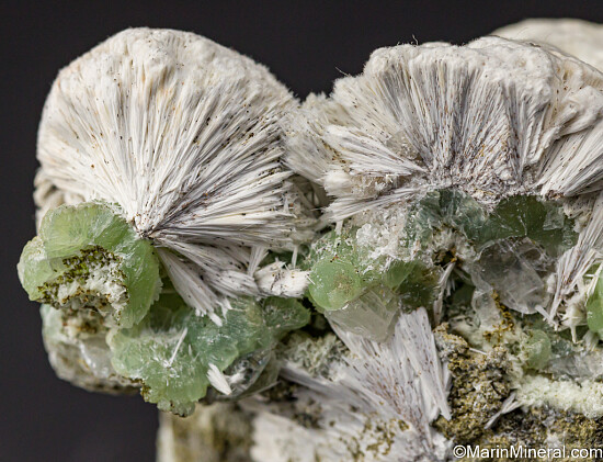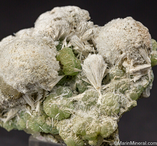 Billowy white spheres of Pectolite atop translucent green Prehnite create a stunning visual treat. Classic old material out of the Chuck Trantham collection.