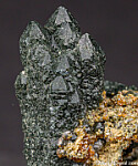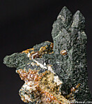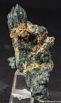 Cluster of complex Quartz crystals, color green by inclusions of Hedenbergite, with areas of attached red Andradite garnets. Ex. Chuck Trantham collection.