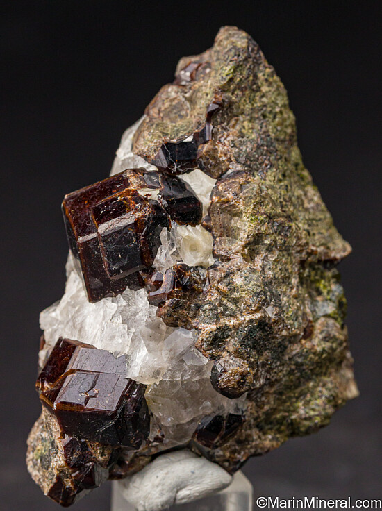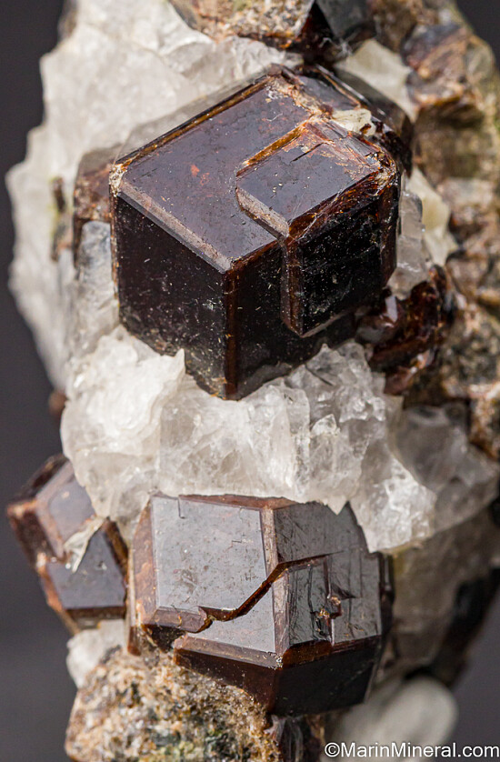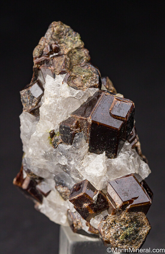 Lustrous red Andradite crystals to 2cm that contrast well against white Quartz. This locality usually produces crystals in dense intergrown clusters and to have such perfect, well isolated crystals is rare. Ex. Chuck Trantham collection, personally collected by Chuck.
