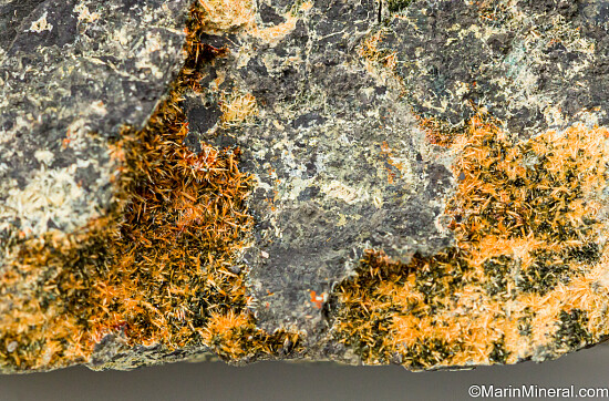 White acicular crystals of Ferristrunzite, a rare phosphate mineral, on matrix from the type locality for the species. Ex. Chuck Trantham collection.