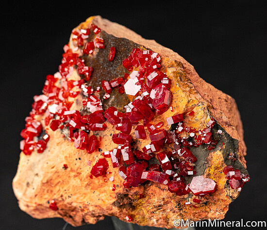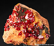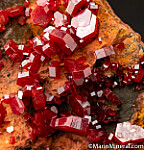 Bright and lustrous 'Coke can' red Vanadinite crystals on matrix. These have high luster on all sides (without the crud that deposits on one side of most of these). From a collection, an old sticker on the bottom shows a price of $120.