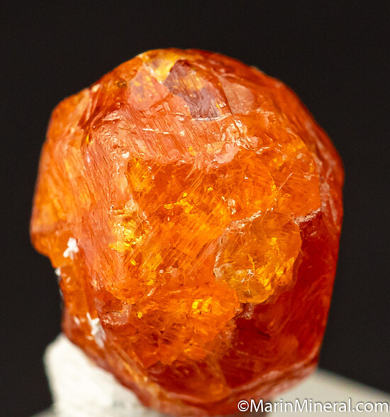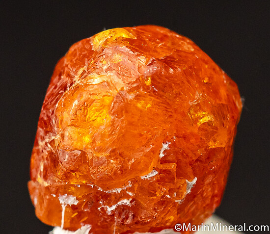 Bright 'citrus' orange Spessartine crystal from famous finds in Tanzania. Most from this locality had black inclusions to some degree, some with just a few specks all the way to fully included making them look black. This one has none!!! It's all transparent to translucent orange. Complete all around with a couple small natural indentations.