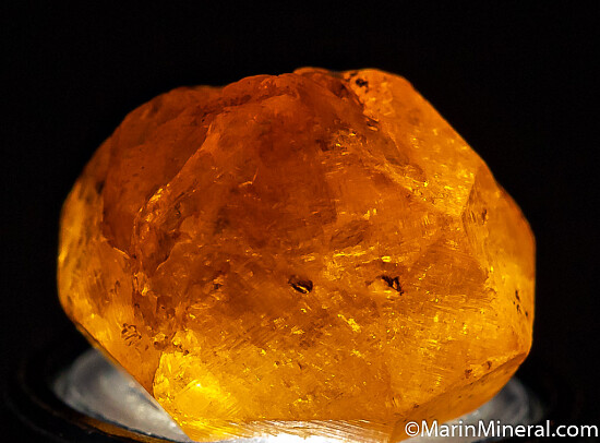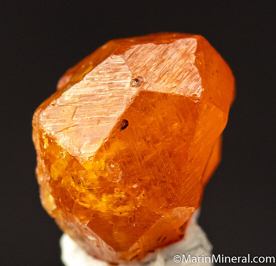 Bright 'citrus' orange Spessartine crystal from famous finds in Tanzania. Most from this locality had black inclusions to some degree, some with just a few specks all the way to fully included making them look black. This one has none!!! It's all transparent to translucent orange. Complete all around with a natural contact on one side where another Spesssartine grew against it.
