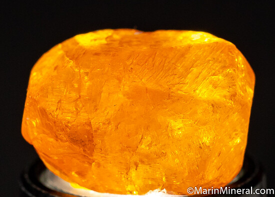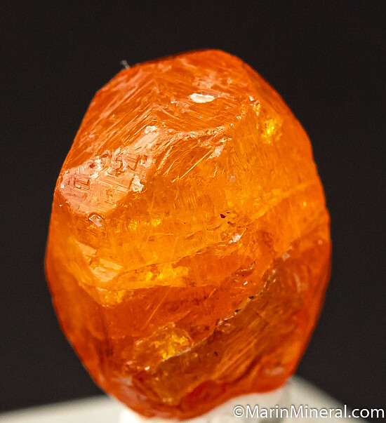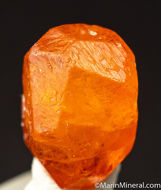 Undamaged single Spessartine with a more elongated form than typical. A great little crystal with good citrus orange color and no black inclusions. Weighs 12.5 carats. A good one!