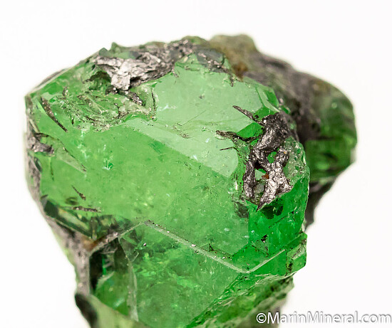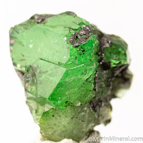 Bright and gemmy green crystal of Tsavorite, a gem green variety of Grossular found in east Africa. Main crystal is 1.5cm wide and has attached and included Graphite. Displays great from the front, with the back and sides showing alot of Graphite and irregualr surfaces.